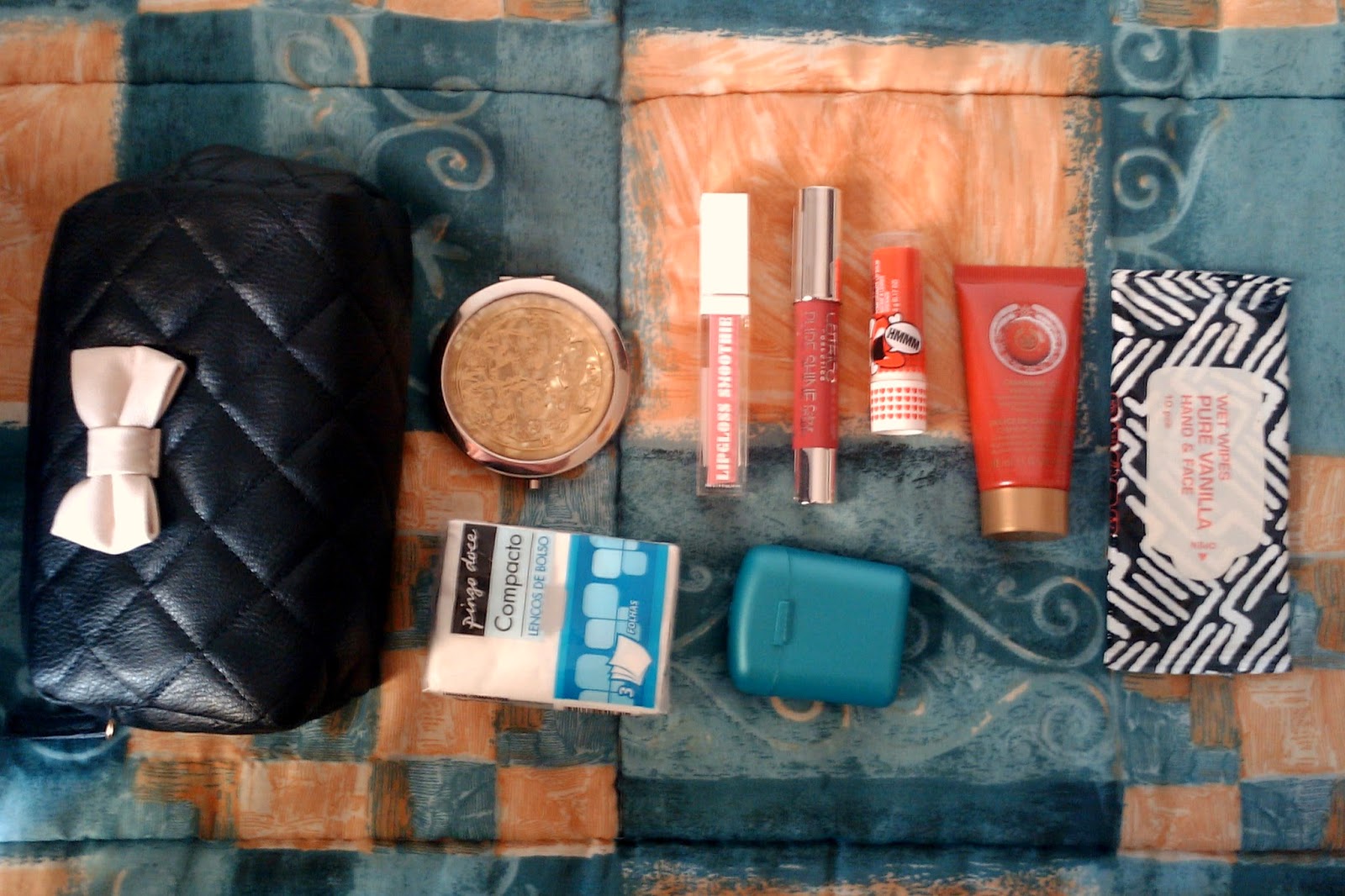 E aqui está o que costumo levar na minha necessaire. A dita cuja foi comprada na Primark, super barata, e cabe lá dentro isto. E ainda sobra espaço.