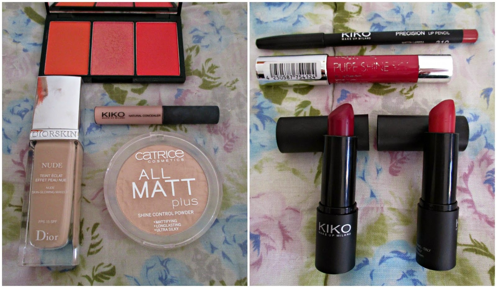 Lábios: Precision Lip Pencil nº310 da Kiko, Catrice Pure Shine Colour Lip Balm em My Berry Cherry, Batons Smart Lipstick da Kiko, nas cores 914 (esquerda) e 913 (direita).
